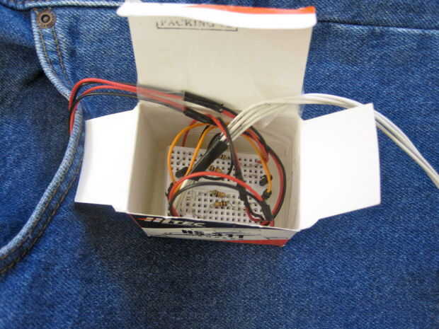 También, crear un moderadamente largo 4-pin conector macho que finalmente se utilizará para conectar el conector hembra en los pantalones al Arduino. Conectores macho y hembra pueden hacerse soldando 4 cables al conector y luego aislar cada cable desde el adyacente conduce con cinta aislante.