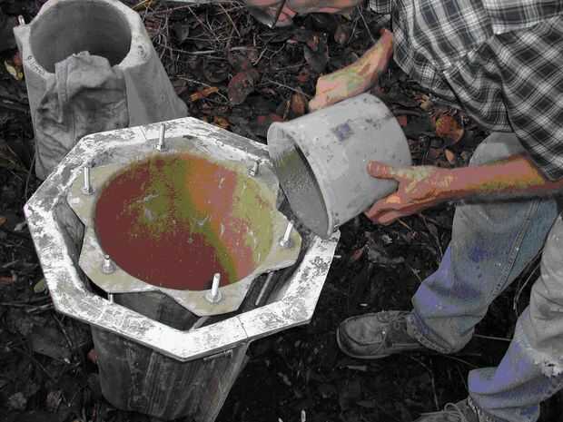 Mezcla dura arena y cemento en una mitad y mitad mezcla arena chorro de arena o arena de río no CORAL o arena fina. Sobre una superficie plana, sobre una superficie plana vierta concreto entre moldes, utilizando un palito para remover el aire, sólo si es necesario. NO SOBRELLENE. Llenar dentro de un centímetro de la parte superior de los moldes. QUE establece y endurece hasta A SHARP puede todavía hacer A surco en superficie del objeto, tiempos de endurecimiento varían con la temperatura y tipo de cemento local. Endurece hasta que el cemento tiene la consistencia de styrafoam. Utilice una burbuja de nivel en algunas direcciones para asegurar que es a nivel y recto. Nota: Vigile el cemento que endurece. Cuando la superficie es dura, pero se puede rayar, retire el molde interno y trazador de líneas plástico para el desbaste la superficie con cepillo de alambre.