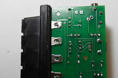 Repita este paso para todos los 4 terminales y cojines. Nos gusta sujetar a la parte inferior de la Junta para las miradas, pero no importa, puede ir en la parte superior o inferior de la PCB. Revisa las imágenes para ver un ejemplo de buenas conexiones sólidas.