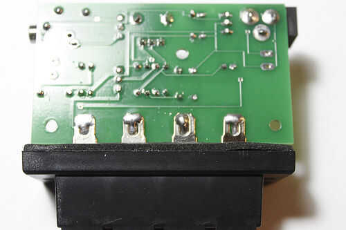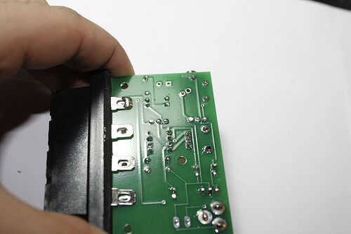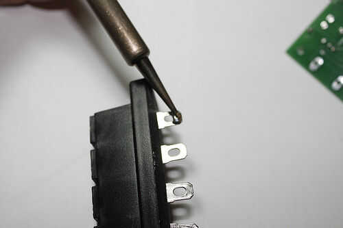 Luego el botón correspondiente en la PCB de la lata. Una vez más, asegúrese de que se trata de una saludable cantidad de soldadura. Ahora el terminal y su correspondiente pad tienen soldadura. Presione la terminal contra la parte inferior de la PCB y con su calor de hierro hasta la terminal y el pad, refundición de la soldadura.