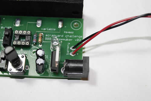 Inserte el cable rojo en el terminal "+" en donde tiene el rótulo "batería" en la PCB. Suelde el cable negro al "-"