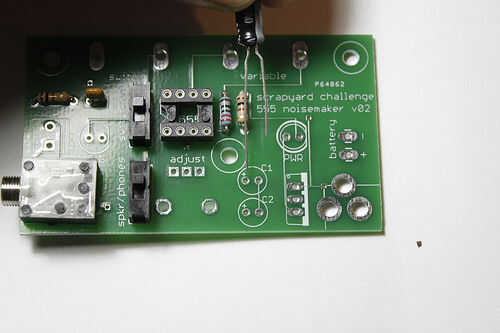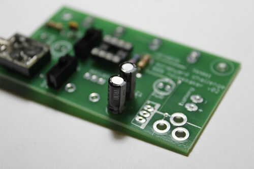 Con cuidado, tome la 4.7uF condensador e insértela en el espacio etiquetado C1. Asegúrese de que la pata larga va en el agujero "+". La pata corta (también mismo lado de la raya) entrará en el otro agujero. Es fundamental hacerlo correctamente! En la soldadura, acortar las piernas.
