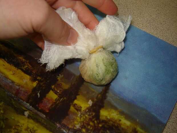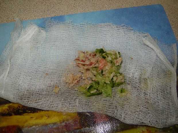 2. poner pepino de patata rallada en una gasa y atar para arriba como un pequeño saco.