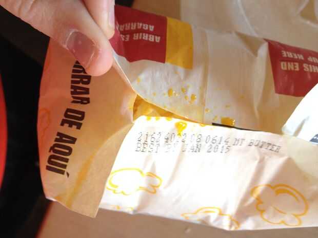 Ahora en la parte superior de la bolsa se verá un pequeño agujero. Sacuda las palomitas boca abajo así que todos los granos de maíz a través del orificio.