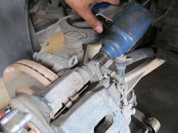 Quitar la parte superior y pernos de montaje del inferior de la pinza. Para evitar daños, cuelgue la pinza para que no se cuelga de la línea de freno.