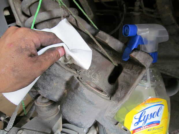 Coloque papel toallas alrededor del cilindro maestro. Esto atrapará cualquier rotura que más líquido fluye desde el depósito. Utilice una abrazadera en C para retraer completamente los pistones en la pinza. Limpie la pinza donde hará contacto con el adhesivo de respaldo en las zapatas de freno (si aún la tienen).
