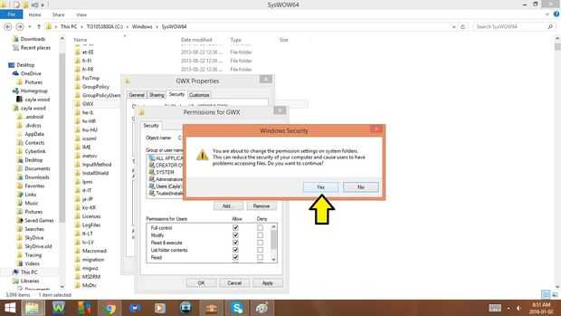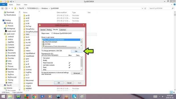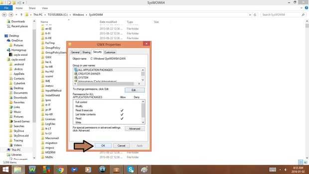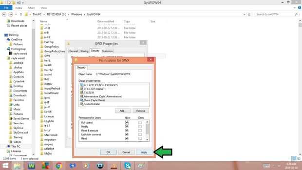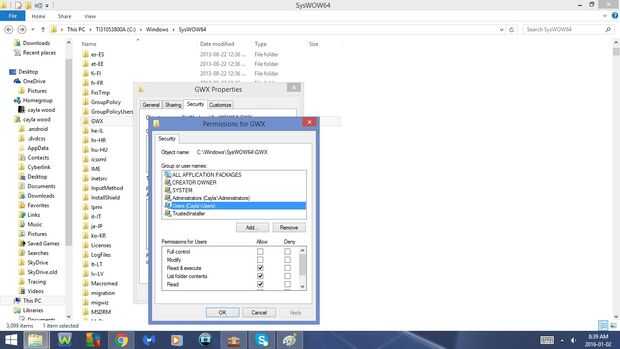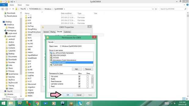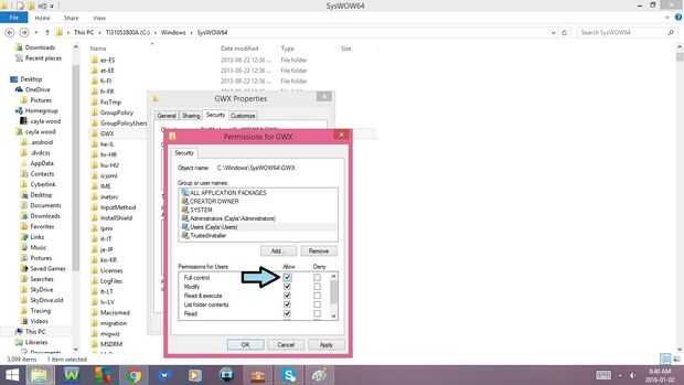 9. concédase permisos completos de Control y los derechos de la carpeta GWX