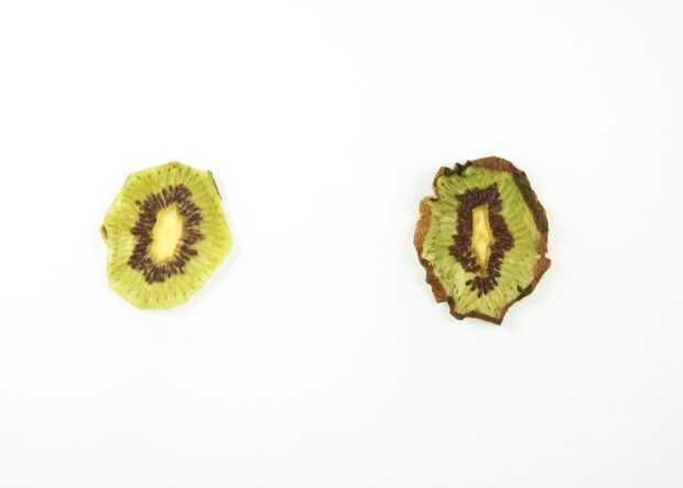 Con el molde que he utilizado, la piel/cáscara/corteza (cualquiera que sea) acaba se cortan de la rebanada de la fruta. A veces la piel termina arrugando y arrugamiento de todas formas en el proceso de secado. Allí no son realmente las normas de esta parte aunque! Sólo asegúrese de que los trozos de fruta de hecho encaja en la parte inferior del molde.