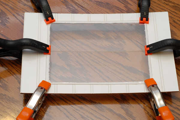 Cuando el pegamento esté seco, perforar agujeros en las esquinas de la hoja de acrílico y utilizar tornillos para fijar en el panel de la puerta. No apriete demasiado los tornillos o se romperá la hoja de acrílico.