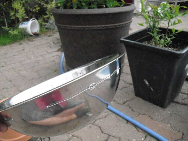 para el uso de rejilla de alambre un martillo y una herramienta de metal con un punto para hacer los agujeros alrededor del borde del tazón de fuente cada 3 pulgadas de así y poner el cable a través de cada agujero de alimentación el cable en el agujero frente a él y continuar haciéndolo así hasta que se ejecute fuera de los agujeros y ata el alambre en los extremos ahora que tienes el cuerpo de la secadora
