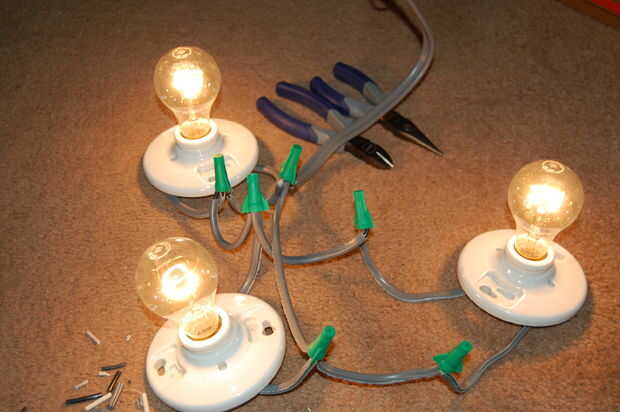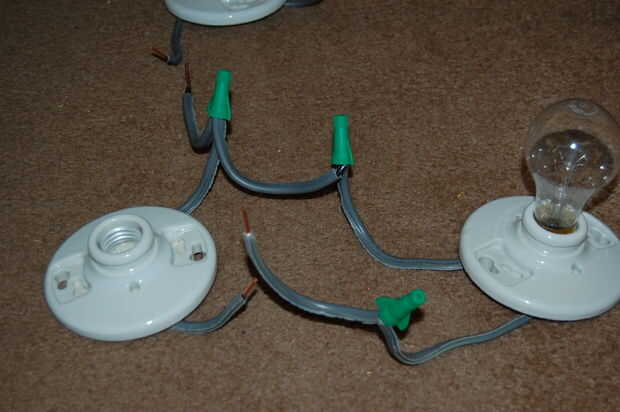 Se trata de un cableado bastante básico establecido. No tener poca o ninguna experiencia en esto y describe lo mejor que puedo. A partir del enchufe de pared, conecte los cables blanco y negro de la clavija en a corta pedazos de cables blanco y negro respectivamente. Para el resto de esto voy hablar sólo alrededor de un alambre, pero es lo mismo para el blanco y el negro. El cable corto que conectado al enchufe, con una vuelta de tuerca en el conector de cable conecta dos cables cortos. Uno de ellos irá a su primera toma de luz, el otro usa otra vuelta de tuerca conector de cable para conectar 2 cables más. Uno de ellos va a su segunda toma de luz y el otro va a la tercera.