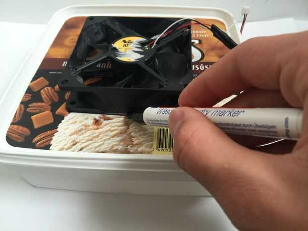 Toma tu caja de helado y coloque el ventilador en la parte superior. Ahora empezar a dibujar una línea alrededor de su ventilador. Cuando se levante el ventilador y proceder al corte. Asegúrese de cortar dentro de su línea de manera que el ventilador puede sentarse en los bordes.