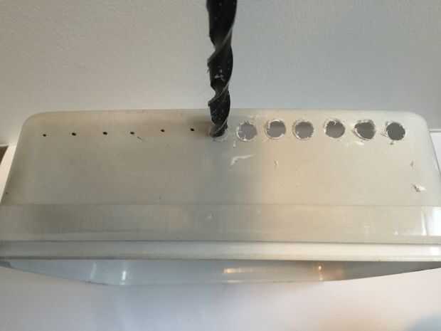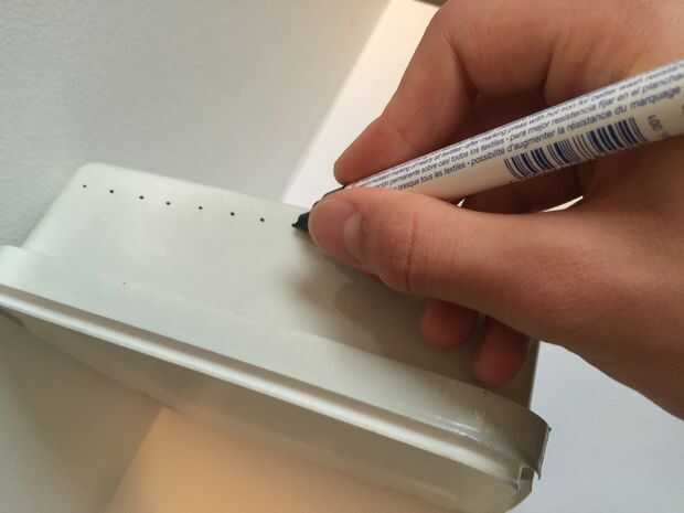 A lo largo de la parte inferior de la caja marca donde vas a perforar los orificios. Cuando haya terminado puede proceder a la perforación. Se debe raspar el plástico sobrante y limpiar todos los agujeros.