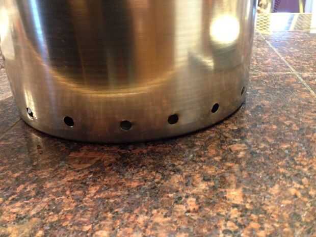 En el fondo, utilicé un 3/8" broca para perforar una serie de agujeros en la parte inferior de la olla. Hizo un poco fuera de la parte inferior para que cualquier grasa estaría atrapado en el bote y no se filtró en la estufa.