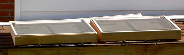 un diseño superior del medio oeste. Adaptado (como se recomienda) para adaptarse a las ventanas tenían en mano, que también utilizo para mis cuadros de frío. Estas ventanas eran aproximadamente 32" por 32", que corresponde muy bien con 32" de ancho galvanizada para techos. No pude conseguir el tipo ondulado en mi zona, sólo el acanalado, así que tuvo que adaptar el sistema de soporte de la pantalla en consecuencia. Usé el cedro a lo largo de para soportar condiciones climáticas sin capa con cualquier pintura o conservantes. También hace los marcos muy ligeros por lo que puedo poner en un techo de cobertizo de 4 1/2 pies de alto.