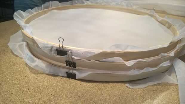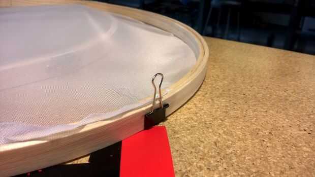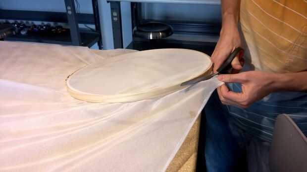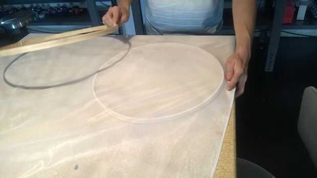 Para comenzar extendemos nuestra tela y pasamos uno de los aros del Controlair por abajo (el mas chico) y el más grande por arriba (las tela quedará en medio) entonces presionamos y ajustamos, ahora hay recortar por fuera del Controlair hasta nos quede una pieza y las necesarias.