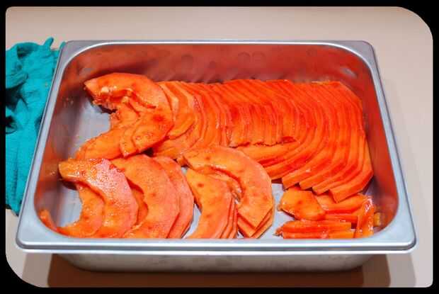 Voy a suponer que han limpiado y cortado su papaya como en la imagen. Todo lo que necesita entonces es un deshidratador de comida y alguna limpieza de pantallas que harán mucho más fácil la limpieza.