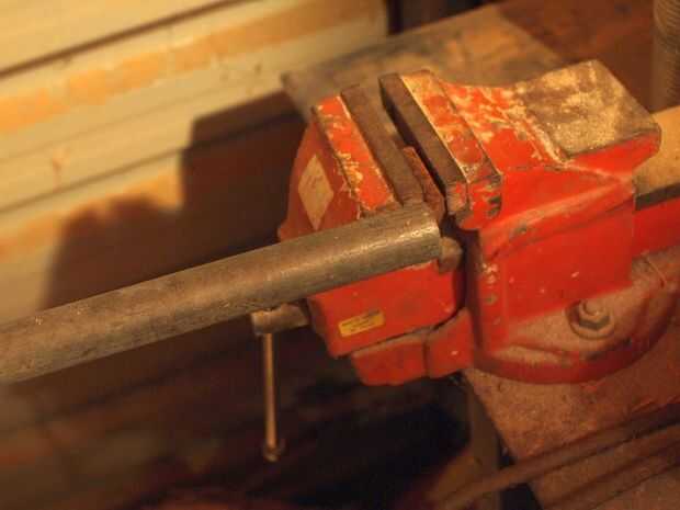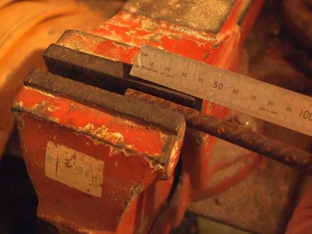 Poner 40mm (1.5") en el tornillo de banco y utilice el tubo para doblarlo un poco más de 90 grados.  Alternativamente, ponga la barra de acero en el tubo (o vice) que sobresale sólo 40mm y luego utilice una llave para doblar (sujetando el tubo con el pie).