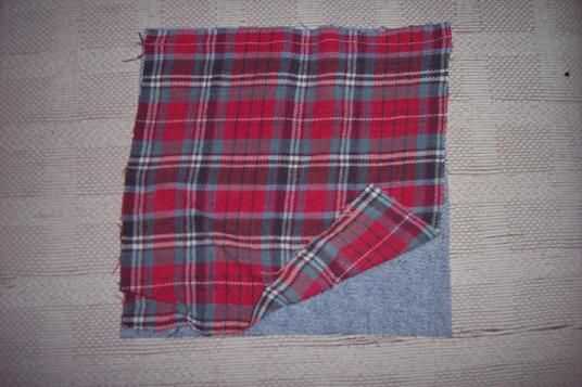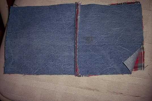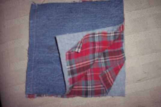 A continuación tomar 2 sets de sus plazas y junte las piezas de la espalda por lo que los 4 cuadrados de material parecen un sandwich con las dos piezas de denim en el exterior (cuadro 2). Coser a través de uno de los extremos con una costura doble o una puntada. Hacer la costura de 1/2 pulgada del borde. Abra a la tela para que la costura se levanta y ambas piezas de mezclilla están en la parte superior. (Imagen 3)