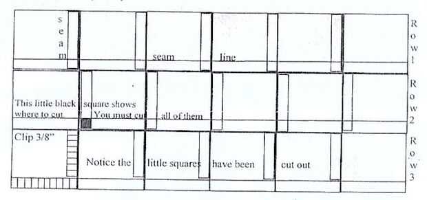 Después recorte todas las plazas, inicia recorte todo lo expuesto costuras aproximadamente cada 3/8 pulg a 1/2 en. No hay necesidad de medir. Sólo aproximada donde el siguiente corte debe hacer los cortes uniformes a lo largo. Las pulgadas cuadrados primera fila 3 de la ilustración se muestra este paso. También recorte de los bordes alrededor del exterior.