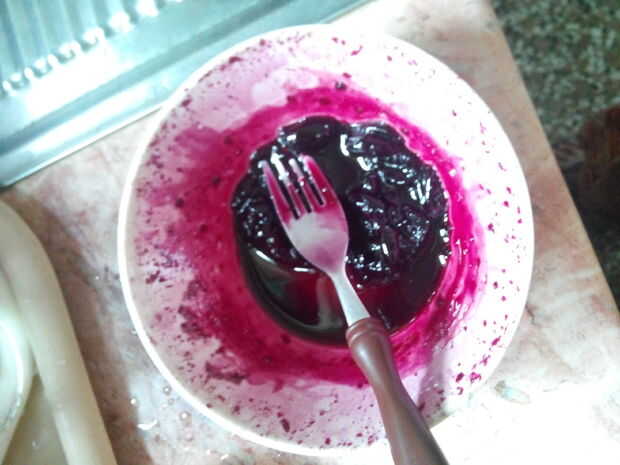 toma completa de la mano (mano a los niños: p) cerezas quitar semillas y azúcar una cuchara. Triturar las cerezas con un tenedor.