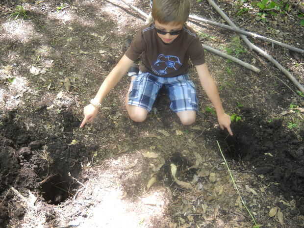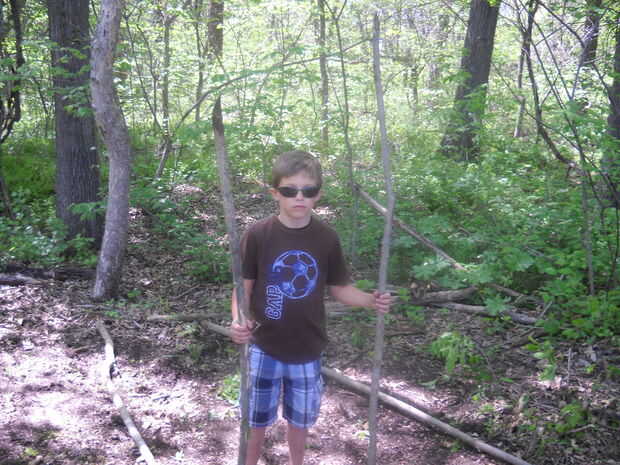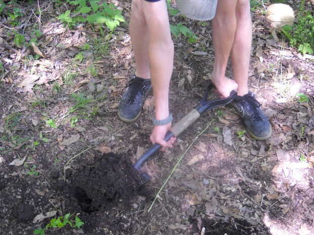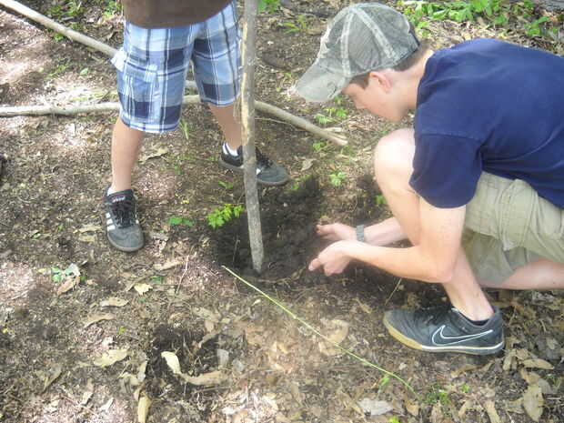 Ahora deberás encontrar dos palos unos 4-5 pies de altura de los soportes principales. Cavar un hoyo de 6-10 pulgadas de profundidad, enterrar el extremo del palo y apisonar la tierra en alrededor de la palanca. Cavar los agujeros tan lejos el uno al otro tan amplia como quieras a tu puerta.