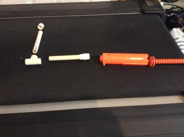 En la primera foto, tengo un pedazo largo de cinco pulgadas de cpvc de media pulgada con cinta aislante que envuelve el extremo de un sello de aire. Recuerde que el extremo de la cinta e interior del émbolo, no fuera como se muestra en las fotos (la razón es fuera es para que puedas ver una vista ampliada). Como se puede ver, al final de cinco pulgadas es una Unión en t, también cpvc de media pulgada. Este entonces se une a un mango del tamaño de su elección, con una tapa en el extremo. Mientras mi longshot destacó no está terminado aún, cuando es, voy a utilizar a algún tipo de pegamento para unir todas las tuberías, porque de lo contrario el mango tiende a lanzar cuando se ceba el blaster (sé que esto probablemente suena vago, pero si este mod y no utiliza algún sellador o pegamento para mantener estos juntos, sabes lo que quiero decir).