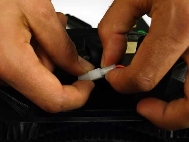 Usando ambas manos, apriete el conector plástico donde el cableado de la batería se conecta a bObsweep y aparte desconéctelo.