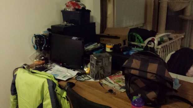Por lo tanto estaba constantemente pensando en maneras de tener mi última plataforma sin ser visto. La posición de donde yo estoy jugando ahora me da una visión libre de la TV así que sentado en otro lugar no es una opción para mí: P. en el internet encontré una foto de una pared montado en computadora. La tarjeta gráfica estaba conectada mediante un cable de extensión de pci-e. Esto me dio una idea increíble. Hay un lugar en mi habitación que no es de ninguna manera. No tiene ninguna función en absoluto. Está entre las piernas de la tabla contra la pared.