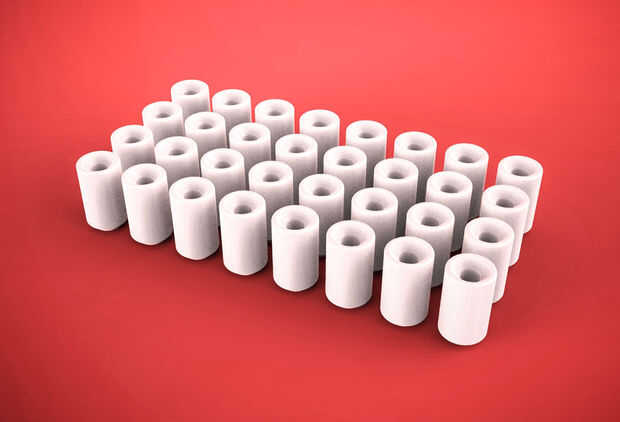 Perforación hacia fuera de la barra de plástico a mano habría sido laborioso e inexacta entonces tenía 32 tapas idénticos impreso en y me enviaron en plástico de elasto de Shapeways. Debido a los costes de material, lo mejor para imprimir estos días los inventores son pequeñas cosas, y estas tapas son tan pequeñas como se pone.