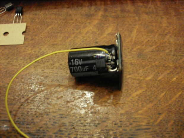 1. El 'cerebro' del pegamento para el condensador lo más cerca posible al cable negativo del condensador.