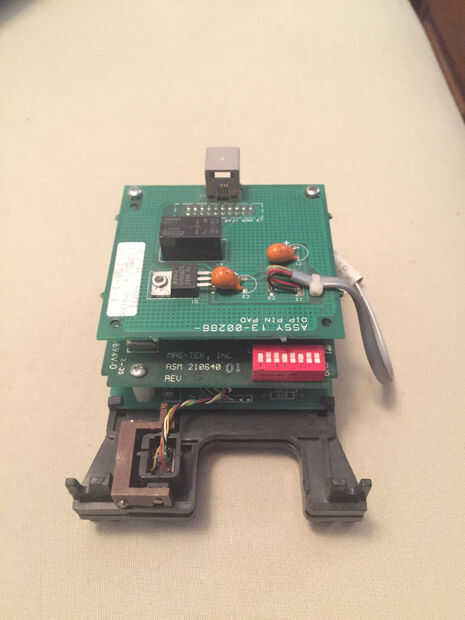 El mecanismo lector original era tarjetas de papel o diseño. Casi parecía que podría ser utilizado para leer tarjetas perforadas. Retirado y lo reemplazó con un lector de inserción serie. Tengo unos cuantos diferentes alrededor de la mayor los visto anteriormente vinieron de un bomba de Gas y son los mejores. Los más pequeños utilizan una interfaz de reloj y datos. No es gran cosa ya que ya tengo una foto a bordo. Podría fácilmente manejar eso también.