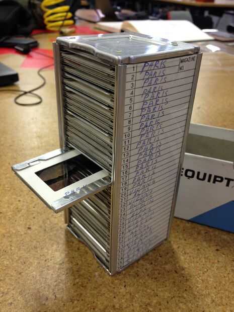 un amigo encontró un conjunto de diapositivas proyector de alguien viaje de Europa a partir de 1960 en una tienda de segunda mano. Fueron encajonados en un soporte de aluminio muy bien retro, y sabíamos que teníamos que hacer una lámpara fuera de ellos.