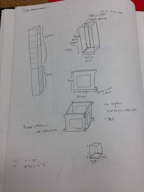 Para esta lámpara, chasis de aluminio del titular de la diapositiva serán la base de la lámpara y también Casa de la fuente de luz. Un tubo cuadrado de acrílico helado se extiende hacia arriba y tiene 7 diapositivas a cada lado. El glaseado difunde la luz y da a cada diapositiva una iluminación uniforme.