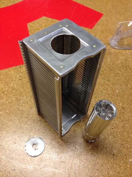 Para crear espacio para la linterna LED en el chasis de aluminio, debemos hacer un agujero en la parte superior. I centro-se perfora el centro del panel superior y utilizan un 1-1/8" agujero Sierra para cortar el agujero. El punzón es importante para evitar que la broca caminando durante la perforación y le da un más exacto del agujero. Asegúrese de fijar el chasis de aluminio, idealmente en un tornillo de banco, antes de perforar.