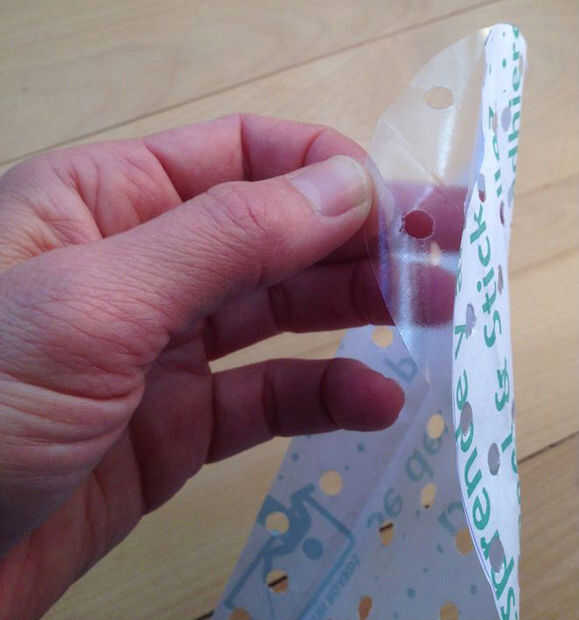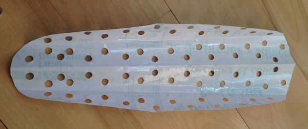 Desplegar la plantilla perforada, despegue la cinta adhesiva y aplique el lado pegajoso de la plantilla a la suela de la zapatilla.