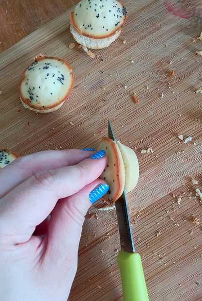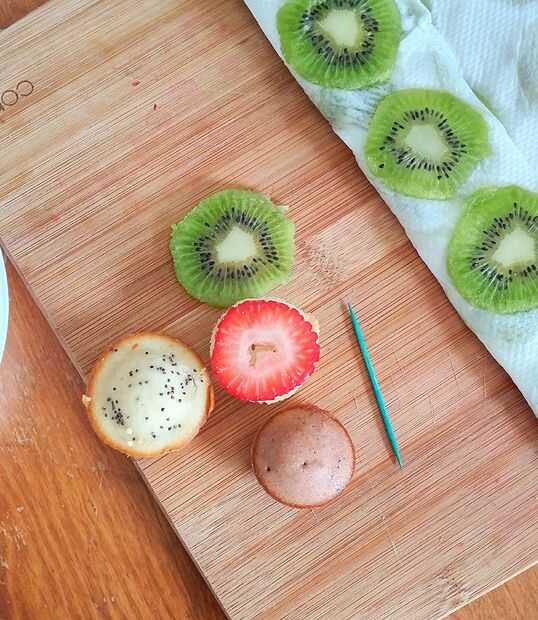La pila a partir de su "bollo parte inferior" y primero añadir una rodaja de fresa, luego el cupcake de chocolate, luego una rodaja de kiwi y por último el "bollo superior". Asegure todo con un palillo o pincho de plástico o de Cóctel tenedor.