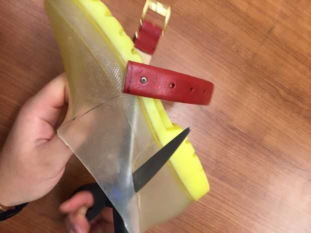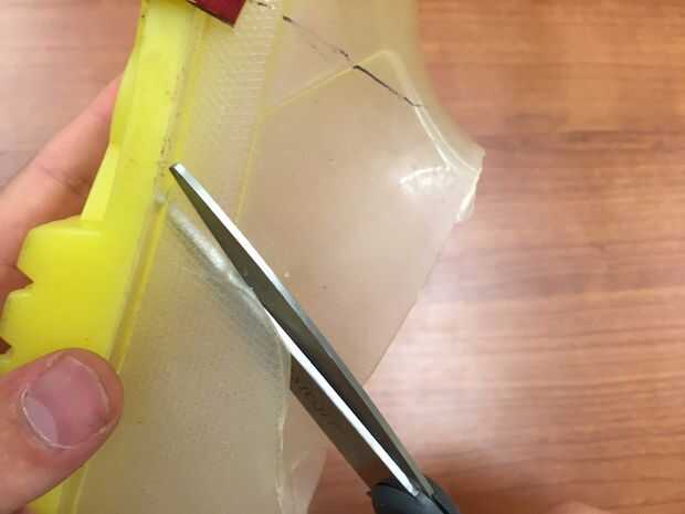 El arranque de este diseño tiene una sección de plástico más difícil sobre la suela de la bota. El corte se hizo a lo largo de este borde para simplificar en este ejemplo. Corte ambos lados de la bota por el camino deseado hasta el dedo del pie.