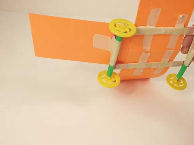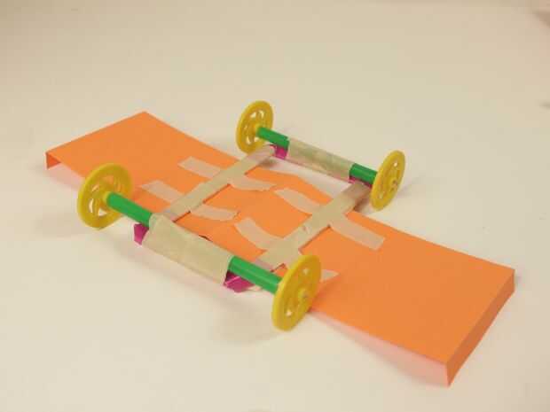Colocar el coche sobre el papel al revés. Utilice cuatro trozos de cinta para fijar el papel a la estructura.