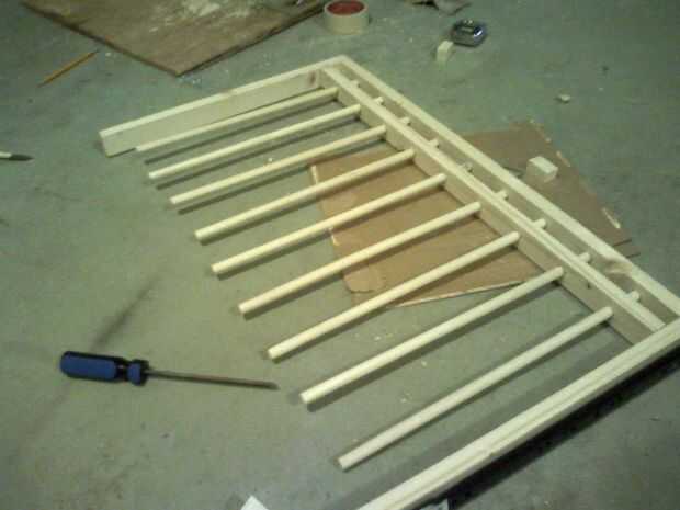 He montado el marco primero virando con clavos y orificios piloto y poner un tornillo por cada lado. Después de algunos ajustes pegué los tacos con algunos elmer en los esteroides.