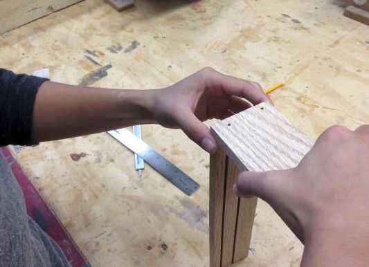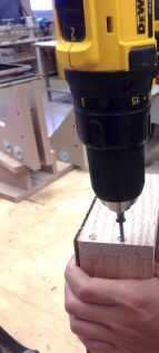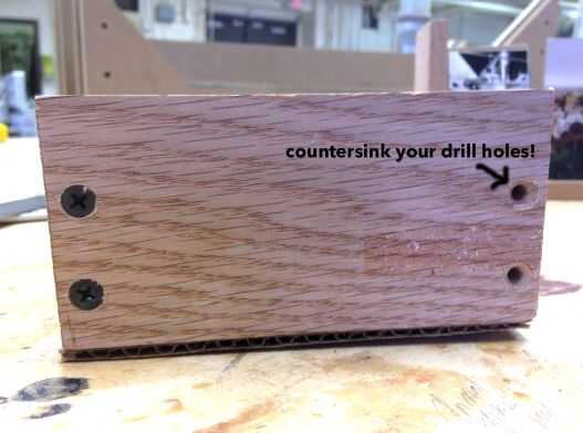 Coloque la pieza de la parte inferior sobre una superficie plana. Luego, tomar una de sus piezas (2) laterales y coincidir con la parte inferior para hacer un ángulo recto. Use un lápiz para marcar donde usted taladrará agujeros (2). * Asegúrese de que el taladro los agujeros no se ejecutan en los cortes de mortajas que acaba de hacer! Una vez que decida dónde colocar sus tornillos, use un avellanado para asegurarse de que sus tornillos de cabeza plana quede al ras contra la madera.