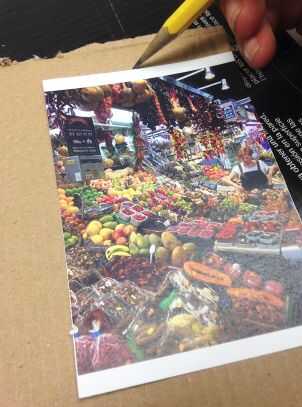 Utilice un palillo del pegamento para pegar cada foto a su pedazo de cartón. Debe tener (5) fotos en la cartulina.