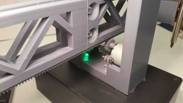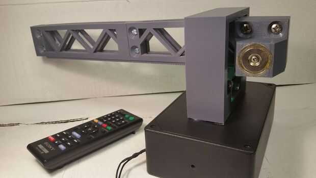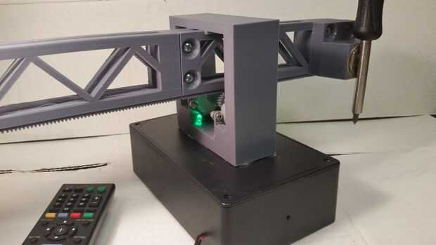 El brazo de la grúa de corredera está diseñado para sostener pequeños objetos metálicos y moverlos hacia adelante y hacia atrás. La grúa se controla mediante un viejo televisor remoto y utiliza un diseño modular que permite que las piezas impresas 3D ser reemplazados fácilmente y permite características adicionales para agregar sin rediseñar completamente el brazo de la grúa de desplazamiento.