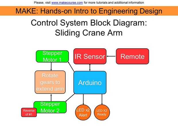 El sistema de control para el brazo de la grúa de corredera se puede dividir en 4 subsistemas. Sí, los motores paso a paso, el receptor IR y los LED es el Arduino. Para ayudar a comprender cómo estos componentes trabajan juntos, hay un diagrama de sistema y un diagrama de Fritzing incluido.