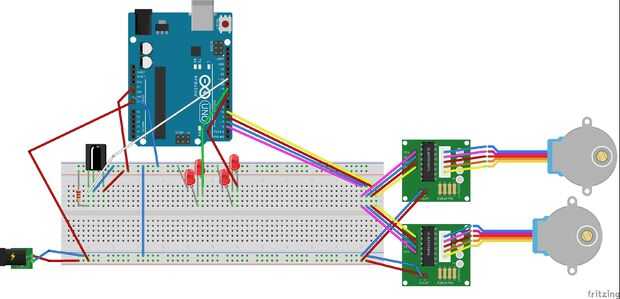 Los motores paso a paso son un poco más. Tenga en cuenta que los motores se conectan a la inversa. Por ejemplo, la fila de la protoboard conecta al pin IN 1 en el controlador de motor es conectada al pin 4 de IN por el otro. Motores paso a paso, en términos simples, trabajan girando en electroimanes en un orden determinado; por el cableado a la inversa, los pasos se ejecutan a la inversa, que significa que el paso a paso se ejecuta en direcciones opuestas. Si los motores gira a la misma dirección, se empujan en direcciones opuestas cuando uno frente al otro. Por cableado ellos juntos de esta manera, confiablemente podemos encender cada motor al mismo tiempo y hacer que gire de forma que empuja a la grúa en la misma dirección.