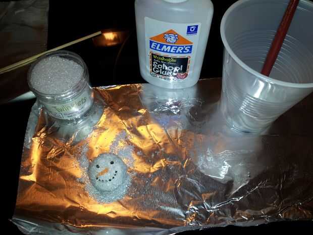 Añadir unas gotas de agua a la escuela de pegamento y mezclar. (Agregar agua sólo hará el pegamento un poco más fino para no cubrir la cara de tu muñeco de nieve.) Utilizar el pincel y aplicar pegamento por todo el ornamento. Mientras el pegamento está todavía húmedo, rollo en las escamas de brillo cristal.