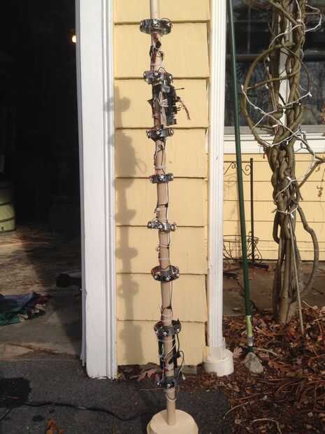 El puntal central es el núcleo de su torre de luz. Es un 4' largo 3/4" diámetro pasador con dos círculos de 3/4" madera que forman la base. Todo en la torre de luz cuelga de esto.