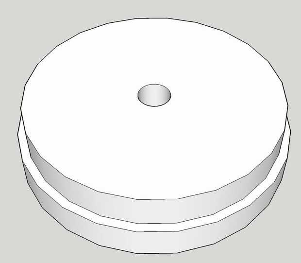 En primer lugar, corta 4 círculos de la placa de 3/4". Dos deben ser 6" de diámetro, y dos deben ser 5 3/4" de diámetro. Círculos son difíciles de cortar, usé un compás para dibujar los círculos, ásperos recorta la pieza, perforaron un pequeño agujero en el centro, después utilizan un pequeño clavo para perno de la pieza que dio vuelta libremente sobre el centro y luego corta el tablero con una sierra de calar con una cuchilla curva sujetando la sierra todavía y girando la pieza debajo de ella. Taladro un 7/8" de diámetro (un poco más grande que el pasador de 3/4") en medio de los dos discos de 5 3/4". Esto mantendrá la espiga central 3/4". Pila de 5 3/4" disco en la parte superior del disco de 6" por lo que están centrados en ellos, pegar con pegamento para madera, sujetarlos y deje secar durante la noche. Se trata de las tapas superior e inferior del tubo, ver la imagen de lo que debe buscar como cuando se hace.