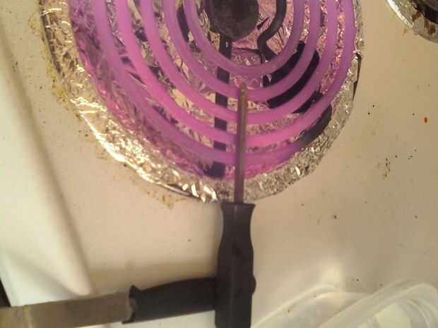 muy bien, así se inicia su elemento, ahora para la diversión! queremos obtener agradable y caliente en todas partes, por lo que necesita poner la hoja del destornillador a través de la hornilla de tal manera que toque tanto como sea posible, sin el mango de plástico está demasiado cerca y fusión. había logrado por apuntalar el mango con un cuchillo de filete, y dejando a través de la hornilla, aunque si tienes una llama abierta, puede ser mejor apuntar el destornillador hacia arriba e inclinar a la llama, así que todo en la llama.