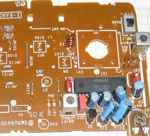También hay 3 'pequeñas cosas rojo'. Son los filtros de cerámica o resonadores, también que ver con el AM y piezas de FM de templar la sección. Polyvaricon condensador tuning y la bobina de sintonía ya han desaparecido, pero puede ver también, algunas otras partes como la 2 pequeña del alambre de cobre bobinas - éstos son parte del circuito FM y el condensador de sintonización Ayude a seleccionar las estaciones en la banda FM. Hay un transistor y un par de diodos de Schottky muy pequeño a la izquierda del tablero. Prueba y recuperarlos si es posible.